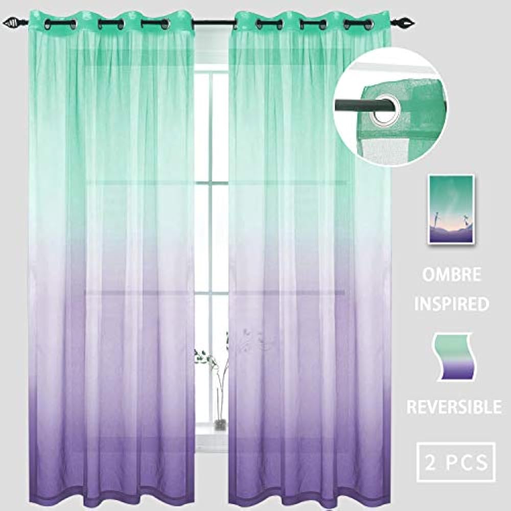 Buy lilac and turquoise curtains for bedroom girls room decor 2 panels reversible ombre pattern window semi short sheer curtains for mermaid room girly nursery kids beach green purple 52 x 63 inch length: